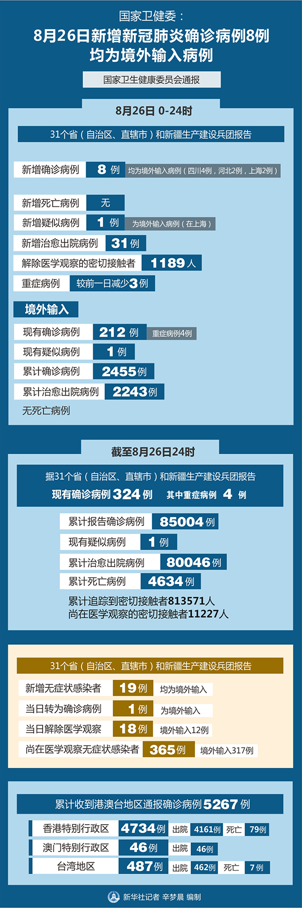 截至8月26日24時,據(jù)31個省(自治區(qū)、直轄市)和新疆生產(chǎn)建設(shè)兵團報告,現(xiàn)有確診病例324例(其中重癥病例4例),累計治愈出院病例80046例,累計死亡病例4634例,累計報告確診病例85004例,現(xiàn)有疑似病例1例。累計追蹤到密切接觸者813571人,尚在醫(yī)學(xué)觀察的密切接觸者11227人。