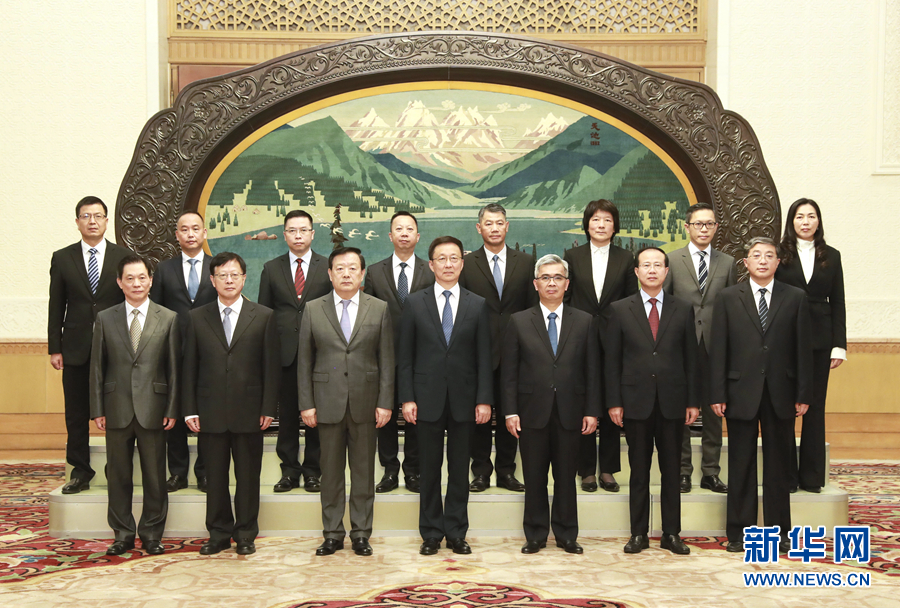 9月16日,中共中央政治局常委、國務院副總理、中央港澳工作領導小組組長韓正在北京人民大會堂會見澳門特別行政區保安司司長黃少澤率領的澳門紀律部隊高層代表團,與他們交流并合影留念。 新華社記者 龐興雷 攝