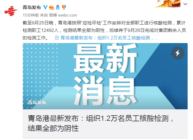 青島港最新發布:組織1.2萬名員工核酸檢測,結果全部為陰性