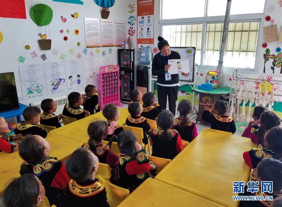 昭覺縣火普村幼教點老師在給孩子們上課。攝于2019年3月。新華社發