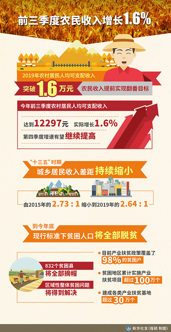 新華社北京10月27日電(記者于文靜)農業農村部副部長劉煥鑫27日表示,2019年農村居民人均可支配收入突破1.6萬元,農民收入提前實現翻番目標。今年前三季度農村居民人均可支配收入達到12297元,實際增長1.6%,第四季度增速有望繼續提高,小康之年農民將有更多獲得感。