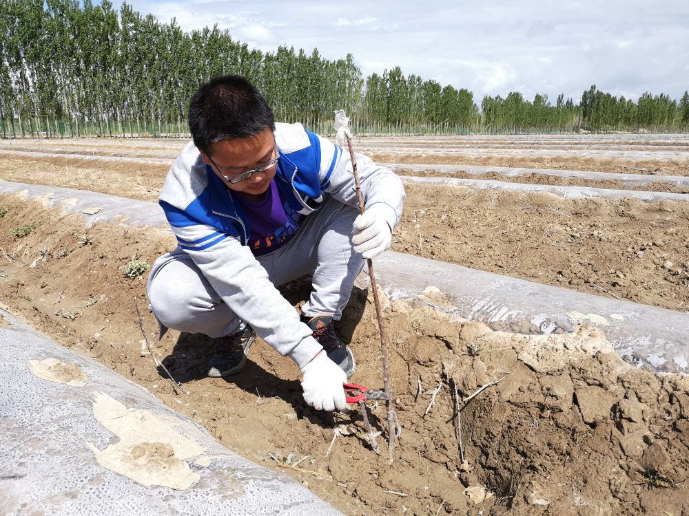 2019年春季,呼延瑋在蘭干村扶貧果園修剪嫁接后的樹(shù)苗。(采訪對(duì)象供圖)