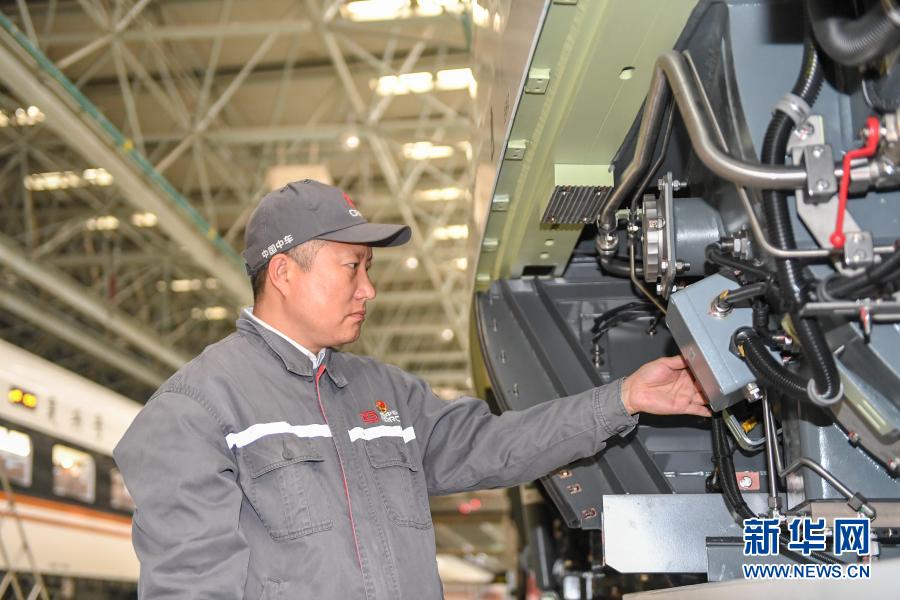 11月25日,在中車長春軌道客車股份有限公司高速動車組制造中心調(diào)試車間,羅昭強檢查復(fù)興號高鐵列車裝置的工作情況。新華社記者 張楠 攝