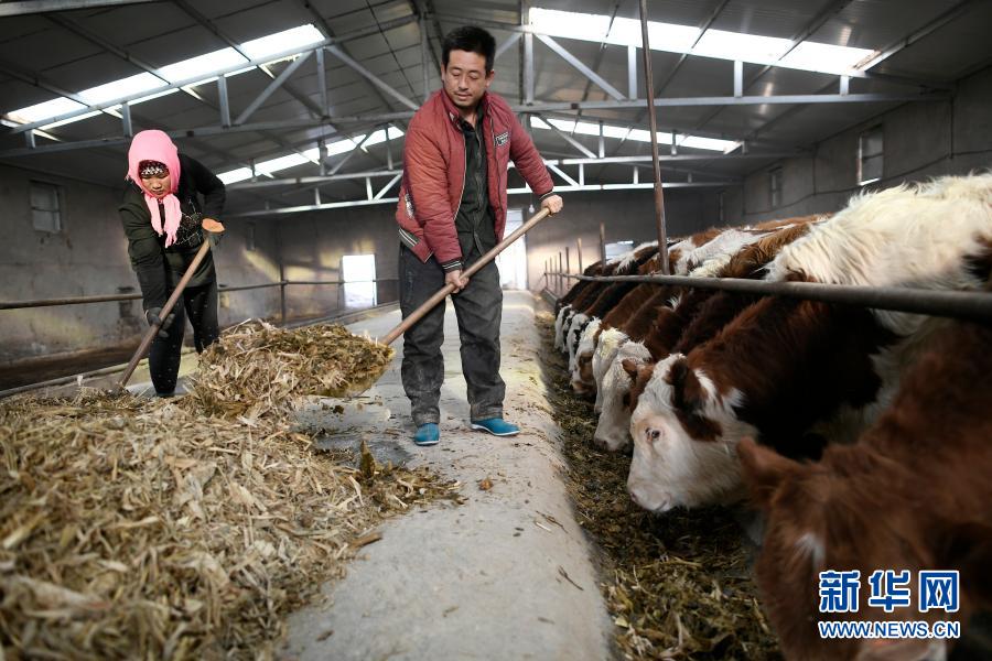 寧夏吳忠市同心縣河西鎮旱天嶺村村民馬國才(右)、馬婷夫婦在村里的養牛合作社喂牛(2017年12月21日攝)。新華社記者 王鵬 攝