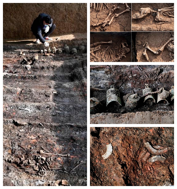 左圖為工作人員在清理河南洛陽徐陽墓地標號為M15的墓葬;右上圖為河南洛陽徐陽墓地標號為M15的墓葬周邊祭祀遺存內出土的動物遺骸;右中圖為河南洛陽徐陽墓地標號為M15的墓葬出土的編鐘;右下圖為河南洛陽徐陽墓地標號為M15的墓葬出土的玉璜