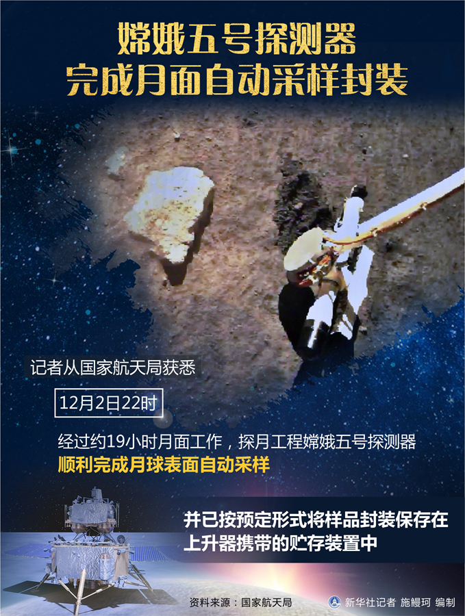 嫦娥五號探測器完成月面自動采樣封裝 有效載荷工作正常-新華網(wǎng)