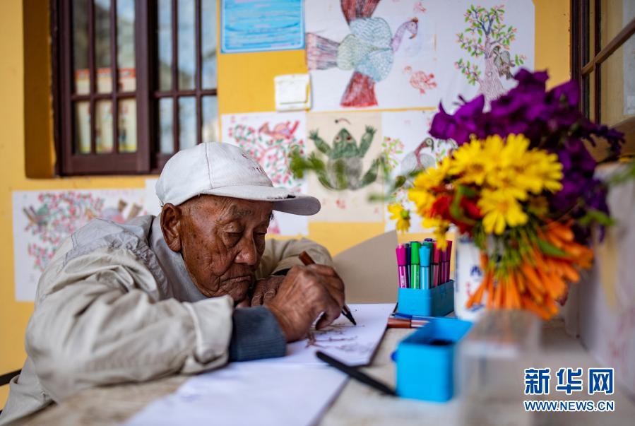 彝族老農羅家政坐在家門口畫畫(11月30日攝)。新華社記者 江文耀 攝
