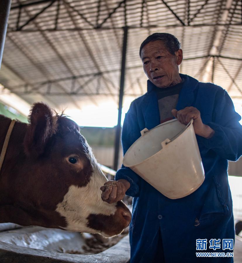 云南省楚雄市子午鎮挖銅村村民羅家旺在村里的養牛合作社喂牛(11月30日攝)。新華社記者 江文耀 攝