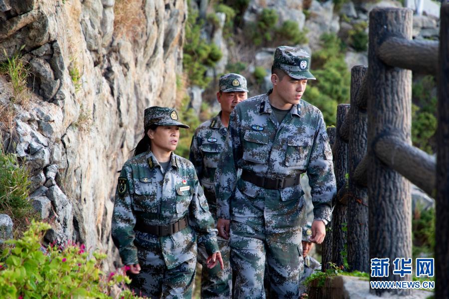 在江蘇省灌云縣開山島,王仕花(左)、民兵哨所所長陳志顯(右)和輪值民兵一起巡邏(9月27日攝)。新華社記者 劉芳 攝