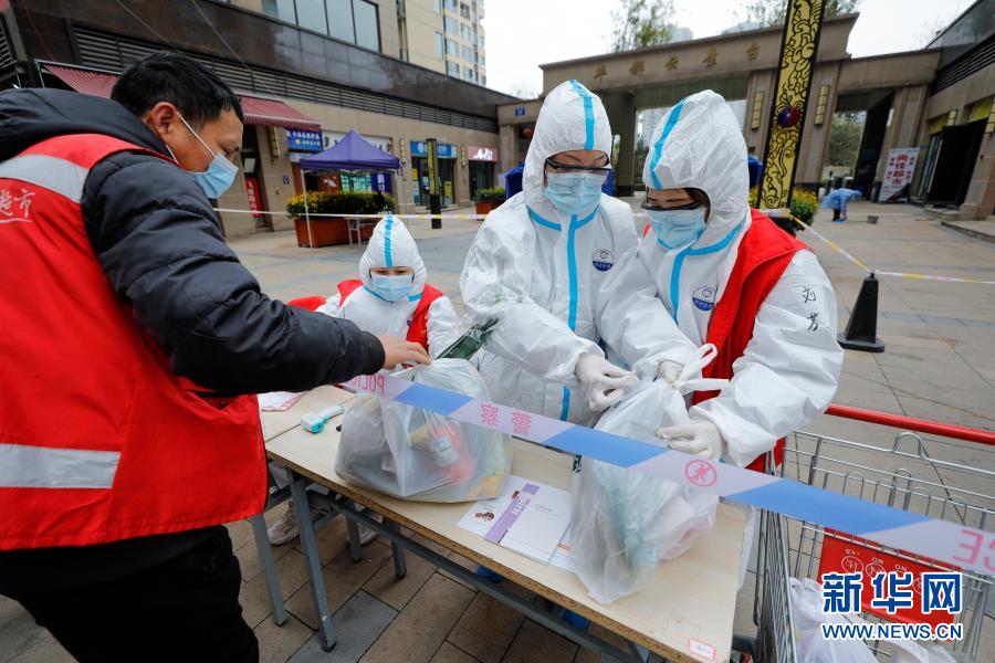12月10日,在成都市成華區崔家店華都云景臺小區外,社區工作人員和志愿者在居民訂購的生活物資上標記房號,由專人送至居民家。新華社記者 沈伯韓 攝