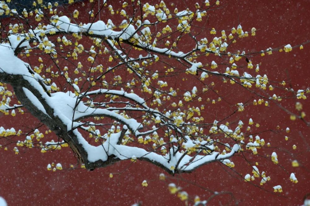 ↑這是2018年1月27日在南京市明孝陵景區內拍攝的雪中梅。新華社發(王躍武攝)