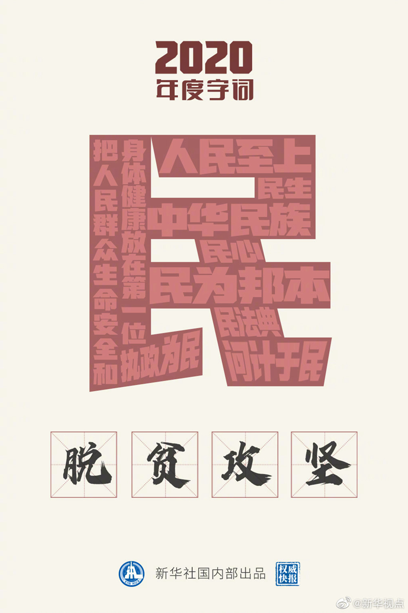 “民”當(dāng)選2020年度“國(guó)內(nèi)字”;“脫貧攻堅(jiān)”當(dāng)選2020年度“國(guó)內(nèi)詞”。國(guó)家語(yǔ)言資源監(jiān)測(cè)與研究中心、商務(wù)印書館等21日發(fā)布“漢語(yǔ)盤點(diǎn)2020”年度字詞,定格我國(guó)年度記憶。這一年,從抗疫抗洪到民法典誕生、謀劃開啟“十四五”新征程,處處閃耀“人民至上”理念;這一年,如期完成脫貧攻堅(jiān)目標(biāo)任務(wù),千年夙愿,今朝夢(mèng)圓!?
