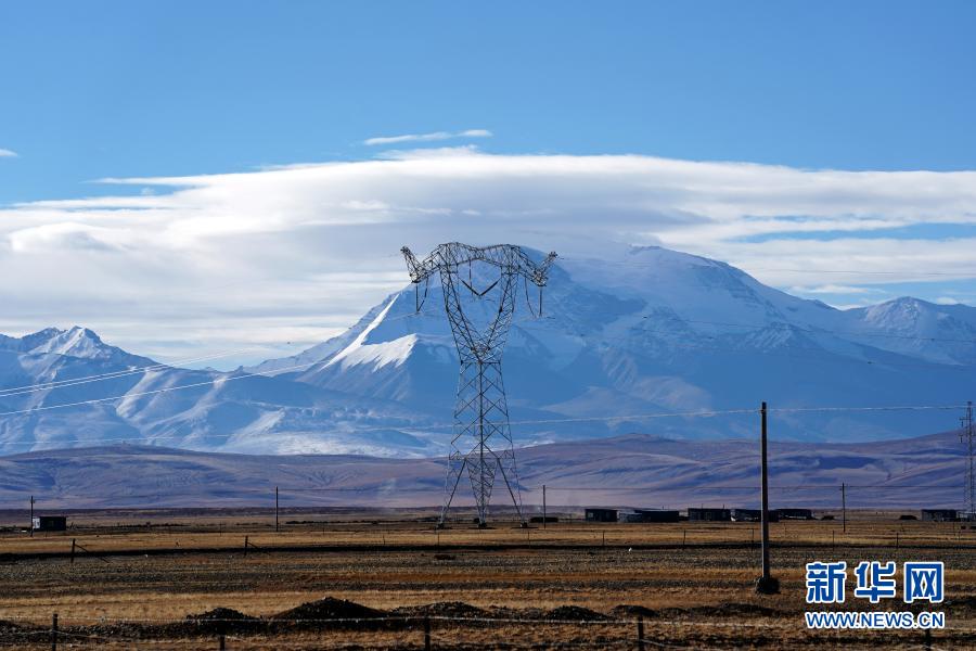這是11月29日在西藏阿里地區普蘭縣拍攝的西藏阿里與藏中電網聯網工程輸電鐵塔。新華社記者 詹彥 攝