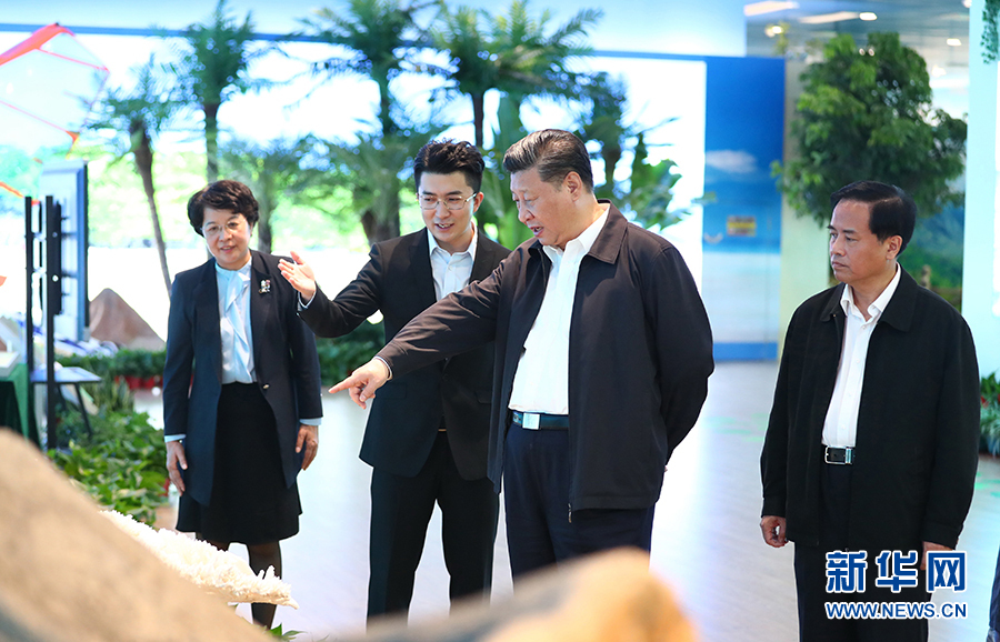 博物館中的生態建設館展示了海南堅持綠水青山就是金山銀山、實施生態立省戰略取得的可喜成績。習近平察看了熱帶海洋島嶼動植物物種基因庫樣本,觀看了自然保護區實時監控畫面,聽取了海南空氣質量監測數據分析,對海南省重視生態環境保護的做法表示肯定。他強調指出,我們黨提出生態文明建設是一個歷史性貢獻。青山綠水、碧海藍天是海南最強的優勢和最大的本錢,是一筆既買不來也借不到的寶貴財富,破壞了就很難恢復。要把保護生態環境作為海南發展的根本立足點,牢固樹立綠水青山就是金山銀山的理念,像對待生命一樣對待這一片海上綠洲和這一汪湛藍海水,努力在建設社會主義生態文明方面作出更大成績。