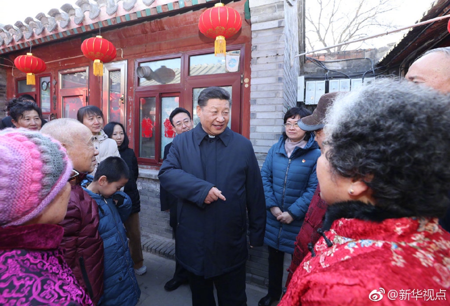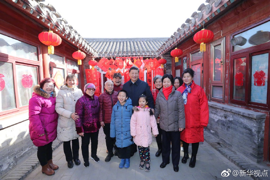 2月1日上午,習近平來到前門東區,沿草廠四條胡同步行察看街巷風貌,聽取區域規劃建設、舊城保護整治、人居環境改善等情況介紹,先后走進兩個四合院看望,同這里的居民一起包餃子、炸饹馇、貼“?!弊帧⒘募页#屑氃儐栕》凯h境有沒有改善、年貨備齊沒有、生活還有什么困難,祝他們生活幸福、新春快樂。四合院里笑語歡聲,習近平對他們說,中國共產黨的追求就是讓老百姓生活越來越好。(記者張曉松、鞠鵬)
