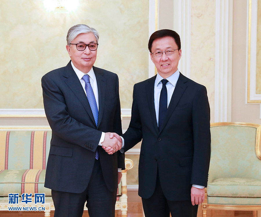 在會見托卡耶夫時,韓正首先轉(zhuǎn)達了習近平主席對托卡耶夫總統(tǒng)的親切問候。韓正說,在兩國元首的戰(zhàn)略引領和親自推動下,中哈全面戰(zhàn)略伙伴關(guān)系快速發(fā)展,雙方政治互信日益加深,各領域合作處于歷史最好水平,在地區(qū)乃至全世界樹立了睦鄰友好、互利共贏的典范。上個月習近平主席同納扎爾巴耶夫首任總統(tǒng)舉行了富有成果的會晤,向他頒授中華人民共和國“友誼勛章”,向國際社會展現(xiàn)了中哈關(guān)系的高水平和特殊性。共建“一帶一路”已成為中哈合作主線,雙方在發(fā)展戰(zhàn)略對接、合作機制建設、重大項目推進等方面碩果累累。中方愿與哈方一道,繼續(xù)深化絲綢之路經(jīng)濟帶與“光明之路”新經(jīng)濟政策對接,以產(chǎn)能、貿(mào)易、互聯(lián)互通、農(nóng)業(yè)、高技術(shù)、金融合作為優(yōu)先方向,不斷提升中哈合作含金量,更好地造福兩國和兩國人民。中方祝愿哈方順利實施“2050戰(zhàn)略”,在國家發(fā)展事業(yè)中不斷取得新的輝煌成就。