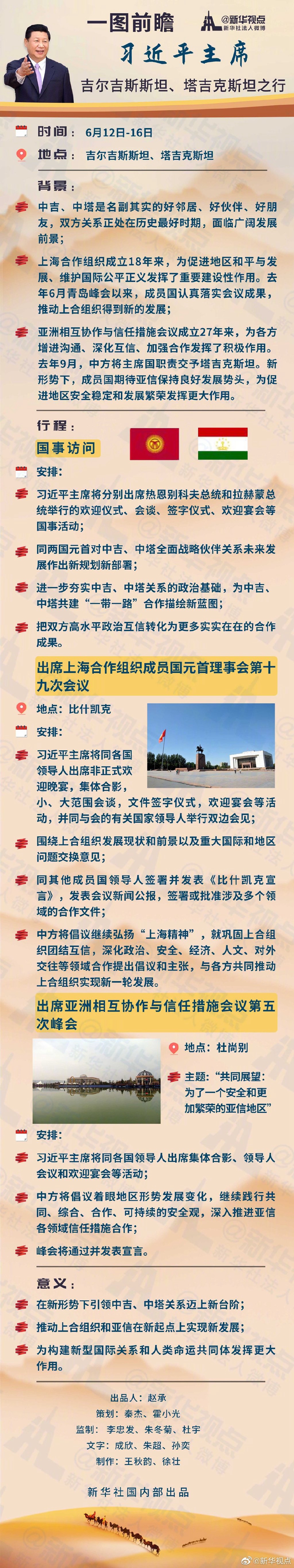 習近平主席將于6月12日至16日對吉爾吉斯斯坦、塔吉克斯坦進行國事訪問并出席在比什凱克舉行的上海合作組織成員國元首理事會第十九次會議和在杜尚別舉行的亞洲相互協作與信任措施會議第五次峰會。這次出訪有啥看點?戳圖秒懂??