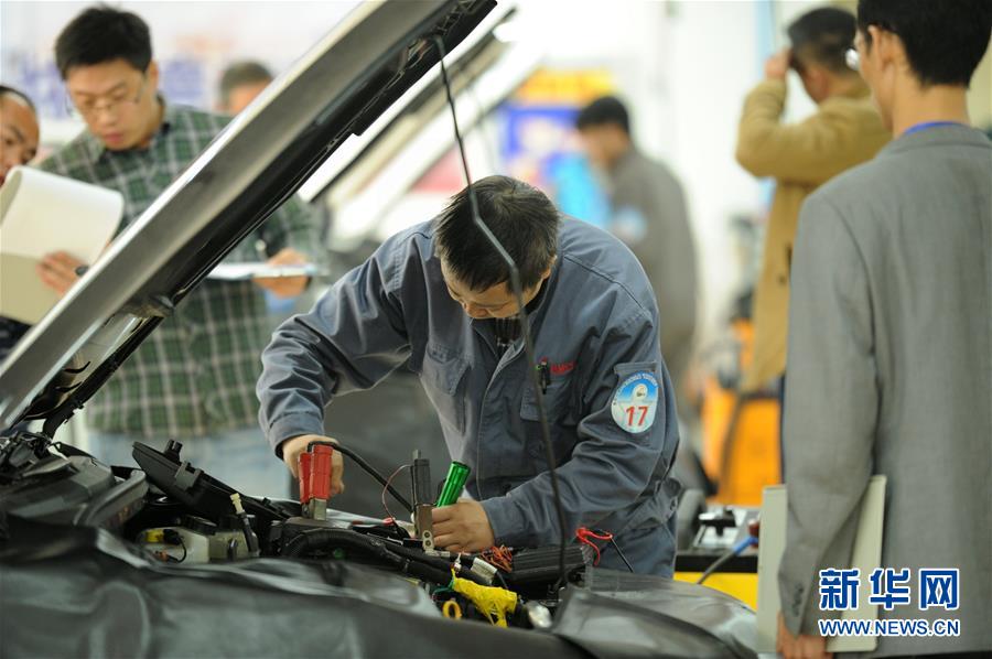 參賽選手在貴陽(yáng)市第二屆技能之星競(jìng)技大賽決賽汽車維修項(xiàng)目比賽中(2015年11月17日攝)。大賽吸引5000余名來(lái)自貴州省中、高等職業(yè)院校的學(xué)生參加。新華社記者 陶亮 攝