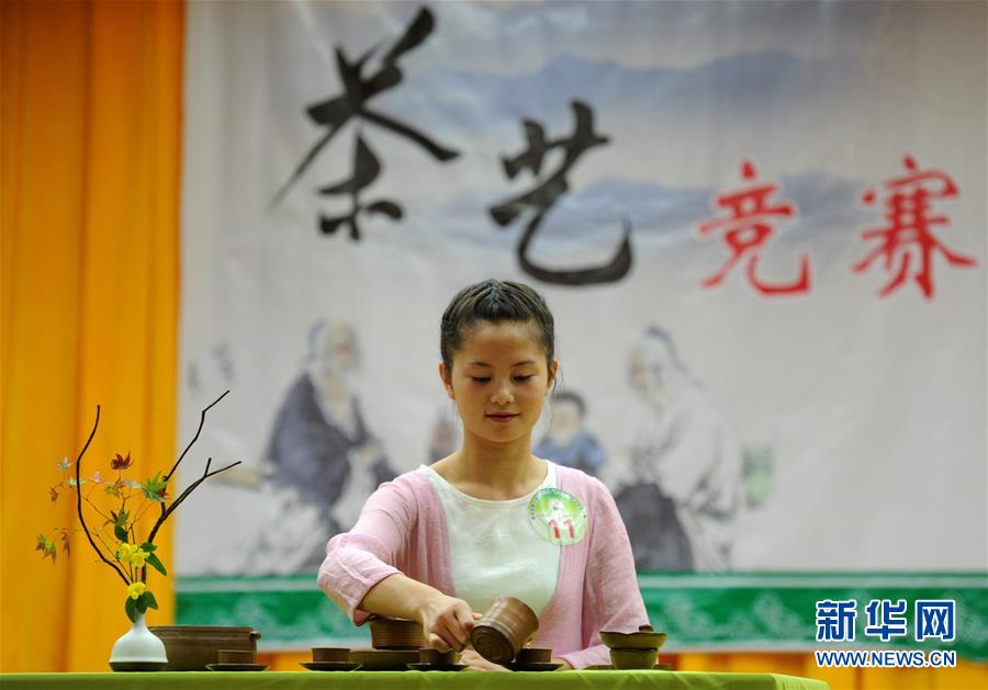 參賽選手在貴陽(yáng)市第二屆技能之星競(jìng)技大賽決賽茶藝展示比賽中(2015年11月17日攝)。大賽吸引5000余名來(lái)自貴州省中、高等職業(yè)院校的學(xué)生參加。新華社記者 陶亮 攝