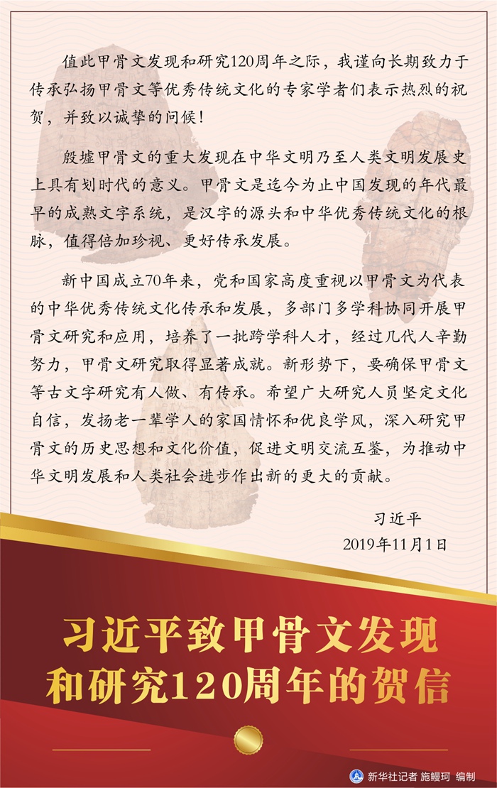 圖表:習近平致甲骨文發現和研究120周年的賀信 新華社記者 施鰻珂 編制
