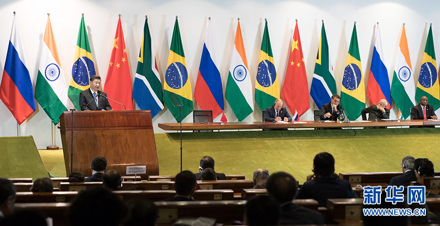 當(dāng)?shù)貢r(shí)間11月14日,金磚國(guó)家領(lǐng)導(dǎo)人同金磚國(guó)家工商理事會(huì)和新開(kāi)發(fā)銀行對(duì)話會(huì)在巴西利亞舉行。中國(guó)國(guó)家主席習(xí)近平、巴西總統(tǒng)博索納羅、俄羅斯總統(tǒng)普京、印度總理莫迪、南非總統(tǒng)拉馬福薩共同出席。這是習(xí)近平發(fā)表講話。 新華社記者 王曄 攝