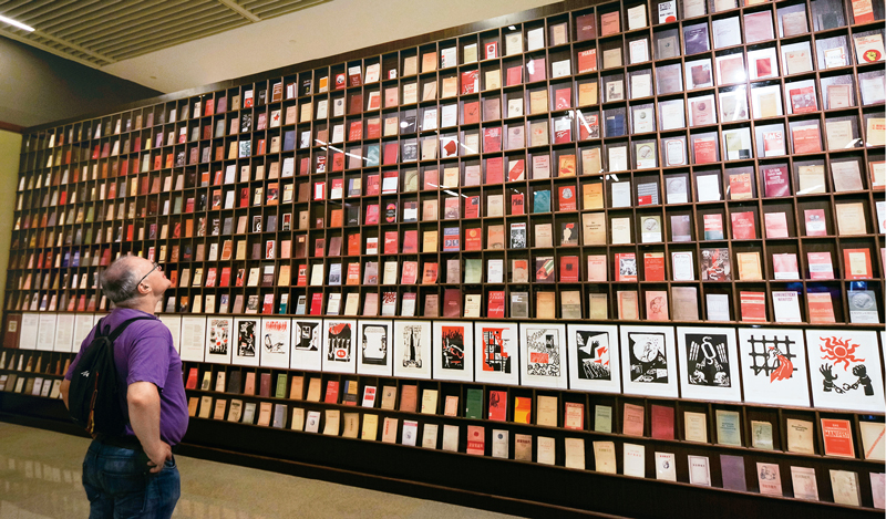 2018年5月9日,一位外國觀眾被北京“真理的力量——紀念馬克思誕辰200周年主題展覽”中一面展示不同國家出版的500多種《共產黨宣言》的書墻所吸引。 中新社記者 賈天勇/攝