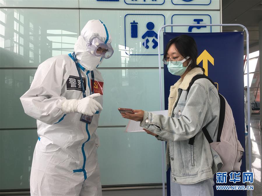3月18日,首都機場公安局境外輸入疫情防控突擊隊副隊長路濤(左)在首都機場T3-D區幫助旅客解決問題。 新華社發