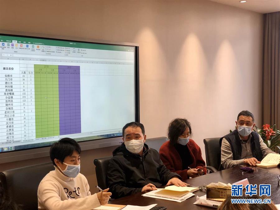 申洲國際集團計劃3月26日包車前往湖北接1000多名員工返崗,集團常務副總經理陳忠靜(左二)加緊協調布置(3月25日攝)。 新華社發