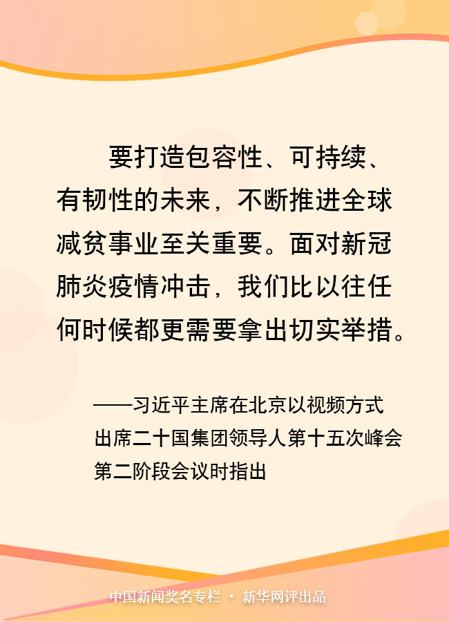 11月22日晚,習近平主席在北京以視頻方式出席二十國集團領導人第十五次峰會第二階段會議,重點闡述關于可持續發展問題的看法。他指出,要打造包容性、可持續、有韌性的未來,不斷推進全球減貧事業至關重要。面對新冠肺炎疫情沖擊,我們比以往任何時候都更需要拿出切實舉措。