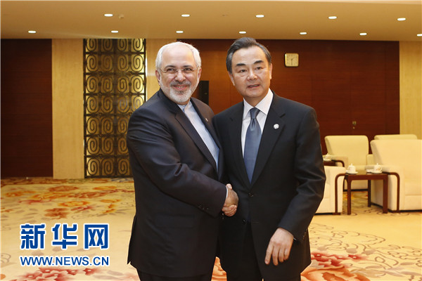 ????5月21日,中國外交部長王毅在上海會(huì)見陪同伊朗總統(tǒng)魯哈尼訪華的伊朗外長扎里夫。 新華社記者 張玉薇 攝