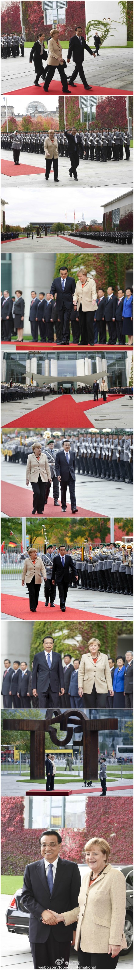 ????新華網(wǎng)北京10月10日電 據(jù)新華社“新國際”微博報道,當(dāng)?shù)貢r間10月10日,德國總理默克爾在總理府舉行隆重歡迎儀式,歡迎李克強(qiáng)總理的來訪。儀式上奏起兩國國歌,李克強(qiáng)在默克爾陪同下檢閱了儀仗隊(duì)。