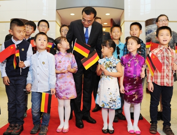 克強總理問了問孩子們的年齡、年級,又跟學校老師聊起孩子們的學習情況,與大家一起合影,鼓勵孩子們“做中德交往的橋梁”。