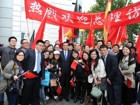 使館主樓外,還有不少中國留學生。他們打著“歡迎總理訪德”的橫幅,揮舞著中德兩國的國旗。見到克強總理走來,他們一下子圍了上去,爭相與克強總理握手。