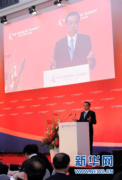 ??? 當地時間10月11日中午,國務院總理李克強在漢堡出席中歐論壇漢堡峰會第六屆會議并發表題為《樹立互利共贏的新標桿》的主旨演講。新華社記者 饒愛民 攝