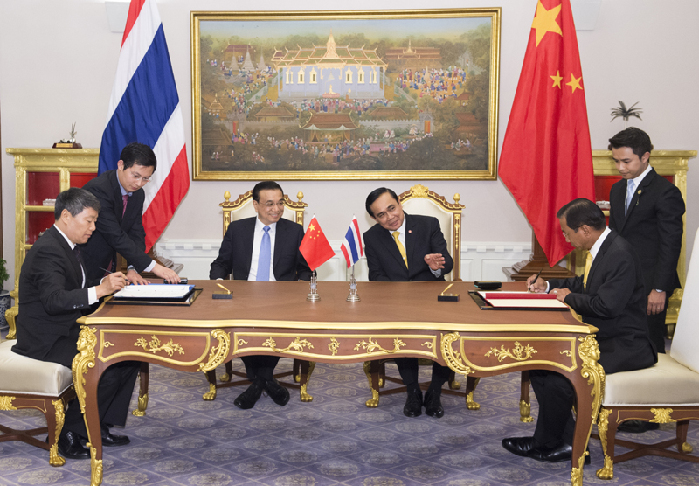 李克強與泰國總理巴育共同見證中泰鐵路合作備忘錄簽署。新華社 黃敬文 攝