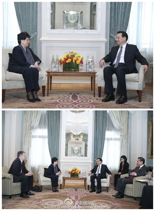 ????新華網北京1月23日電 據新華社“新國際”微博報道,李克強總理22日在蘇黎世會見世衛組織總干事陳馮富珍。他說,中國將盡一個發展中大國的責任,繼續向埃博拉疫區提供力所能及的幫助,與國際社會一道幫助疫區人民早日驅除病魔。他贊揚陳馮富珍多次親赴疫區,表現出了該組織的無畏精神。