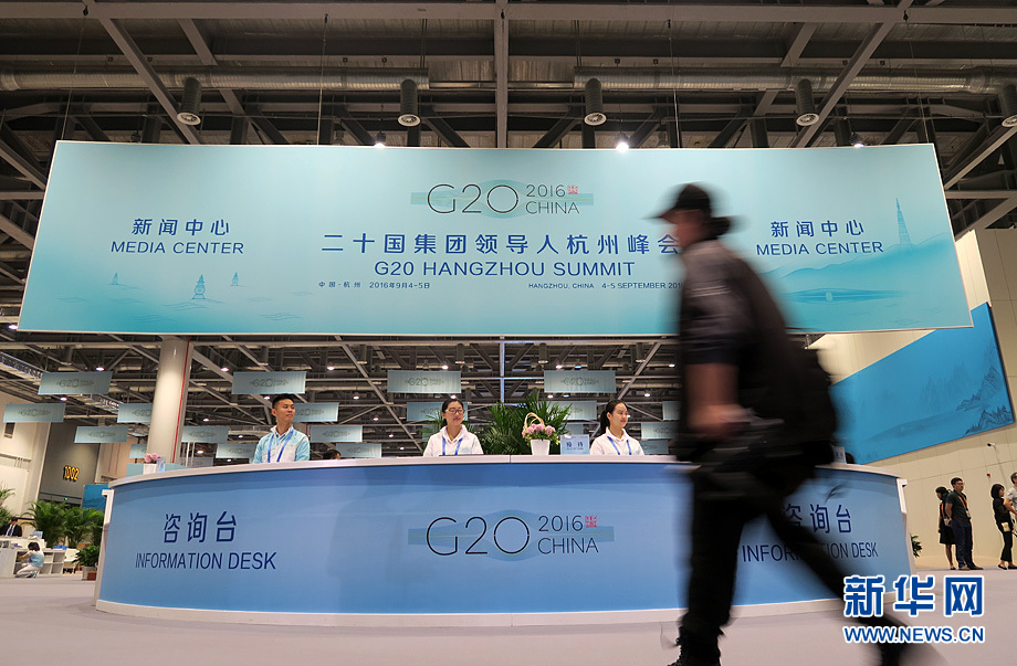 9月4日上午,金磚國家領導人非正式會晤在浙江杭州舉行。當日,G20峰會新聞中心一派繁忙景象。新華網記者 陳競超 攝