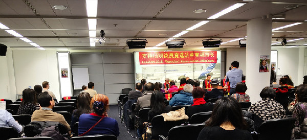 當(dāng)?shù)貢r(shí)間20日下午,近百名旅居德國法蘭克福的華人在德國法蘭克福機(jī)場(chǎng)舉行會(huì)議,為首位競(jìng)選法蘭克福市市長的德國華人楊明先生吶喊助威,組織選票。