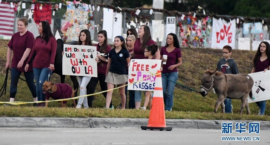 當(dāng)?shù)貢r間2月28日,美國佛羅里達州帕克蘭,發(fā)生槍擊案的道格拉斯中學(xué)復(fù)課,學(xué)生和教職工重返校園,大批警察出動維護治安。2月14日,一名19歲的槍手在學(xué)校里開槍,造成17人死亡。(圖片來源:視覺中國)