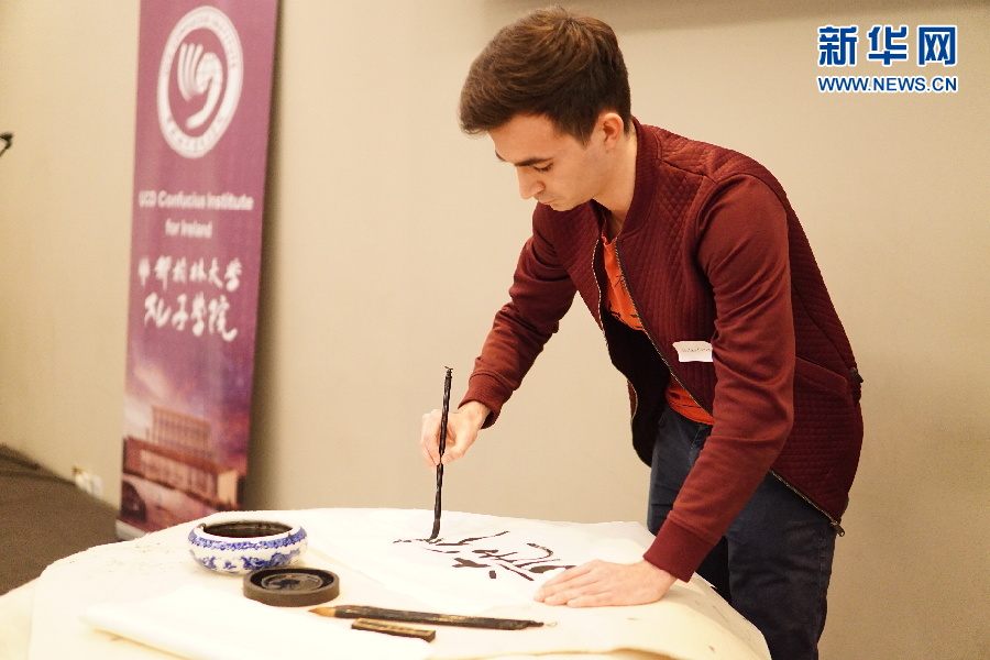 參賽者在表演中國書法。4月7日,第17屆“漢語橋”世界大學生中文比賽愛爾蘭賽區選拔賽在首都都柏林舉行。新華網發
