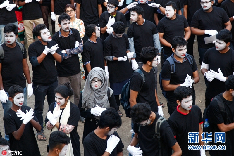 當地時間2018年4月8日,孟加拉國達卡,2018年國際啞劇節在達卡開幕,超過254名啞劇演員齊聚達卡大學參加表演,成為全世界啞劇演員最多的表演節目,破吉尼斯世界紀錄。(圖片來源:東方IC)