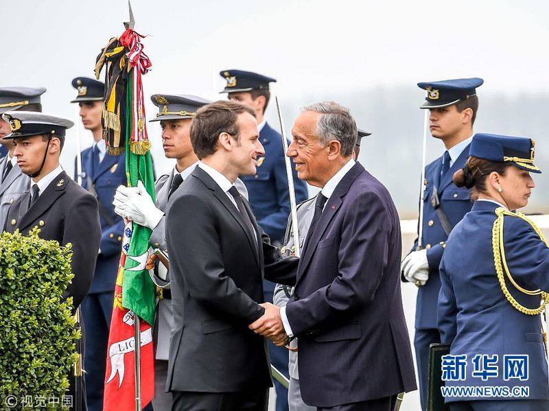 4月9日,法國里什堡,法國總統馬克龍和葡萄牙總統馬塞洛·雷貝洛·德索薩在一戰葡萄牙公墓出席一戰紀念儀式,紀念利斯戰役百年。(圖片來源:視覺中國)