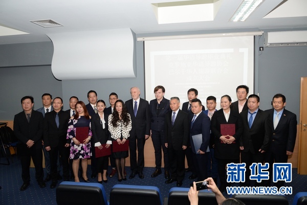 4月11日,中國駐克羅地亞大使胡兆明(左一)與克羅地亞華語導游協會會長蔣曉亮(右一)在薩格勒布為當天成立的克羅地亞華語導游協會和巴爾干華人旅游協會揭牌。新華社記者高磊 攝