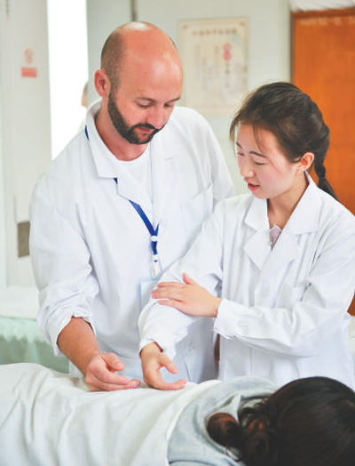2017年7月,11名西班牙“洋中醫”來到位于昆明市的云南省中醫院學習推拿和針灸。圖為中國老師指導“洋中醫”。人民視覺