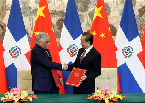 王毅表示,剛才我同巴爾加斯外長正式簽署了《中華人民共和國和多米尼加共和國關(guān)于建立外交關(guān)系的聯(lián)合公報》。就在半個小時之前,多米尼加發(fā)布總統(tǒng)公告,宣布承認一個中國原則,與臺灣地區(qū)斷絕所謂“外交關(guān)系”。這是中多兩國建交的基本前提。在我們簽署的這份建交公報中,多米尼加共和國政府承認世界上只有一個中國,中華人民共和國政府是代表全中國的唯一合法政府,臺灣是中國領(lǐng)土不可分割的一部分。據(jù)此,中華人民共和國從即日起和多米尼加共和國建立大使級外交關(guān)系。