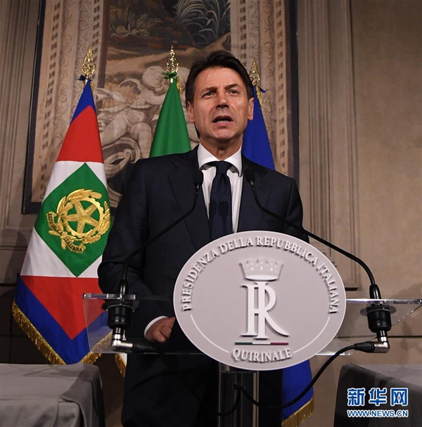 5月27日,在意大利首都羅馬,意新任總理孔特發(fā)表講話。據(jù)當(dāng)?shù)孛襟w報(bào)道,孔特27日晚間與總統(tǒng)馬塔雷拉會(huì)面并提交擬定的內(nèi)閣成員名單時(shí),馬塔雷拉否決了由意大利聯(lián)盟黨和五星運(yùn)動(dòng)力推的持疑歐立場(chǎng)的經(jīng)濟(jì)學(xué)家保羅·薩沃納出任財(cái)政部長。孔特向總統(tǒng)提出放棄組閣任務(wù)請(qǐng)求,請(qǐng)求得到總統(tǒng)確認(rèn)。新華社發(fā)(阿爾貝托·林格里亞攝)