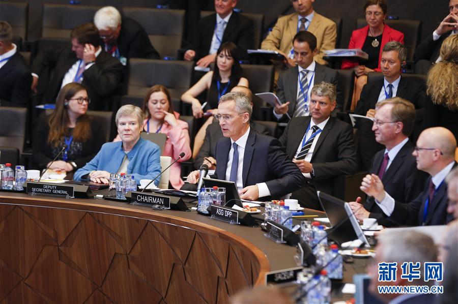 6月7日,在位于比利時(shí)布魯塞爾的北約總部,北約秘書長(zhǎng)斯托爾滕貝格(中)主持北約防長(zhǎng)會(huì)。新華社記者葉平凡 攝