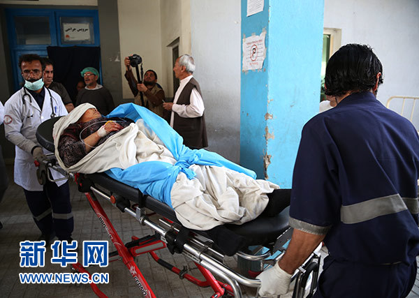 6月11日,在阿富汗首都喀布爾,人們將一位襲擊事件中受傷的婦女送往醫(yī)院。新華社發(fā)(拉赫馬特 攝)