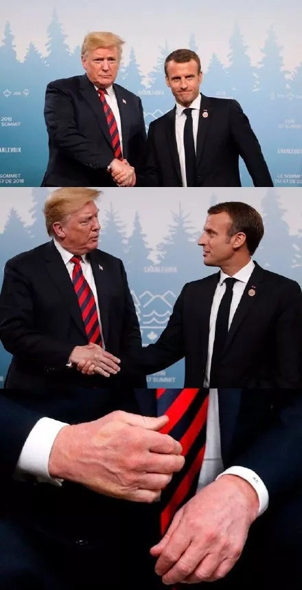 兩人在G7見面握手時,馬克龍毫不客氣地把特朗普的手握出了白印子……