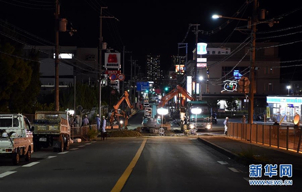6月18日,在日本大阪,工程人員搶修破損道路。據(jù)日本氣象廳消息,當(dāng)?shù)貢r(shí)間18日上午7時(shí)58分,日本大阪府發(fā)生6.1級(jí)地震。新華社記者馬平 攝